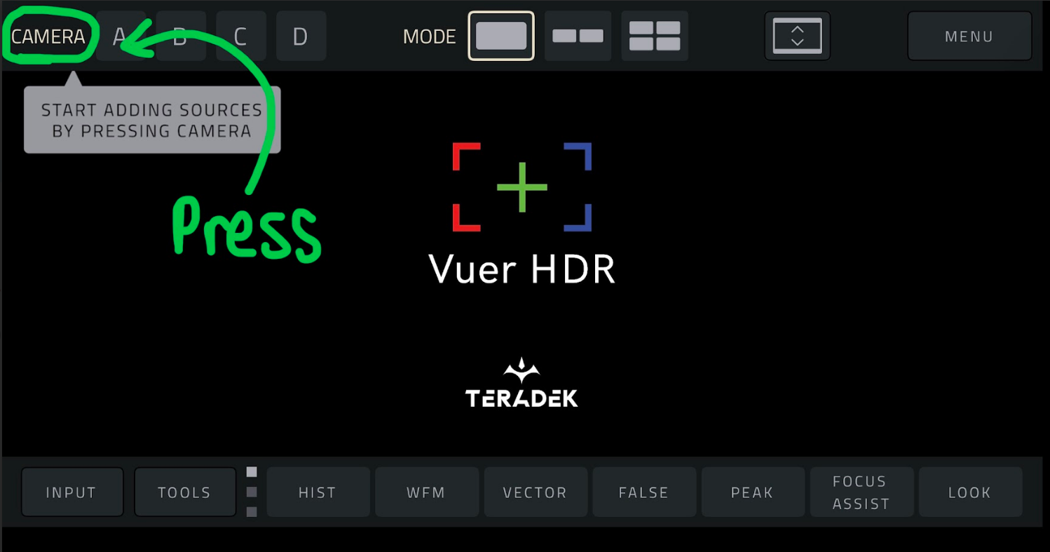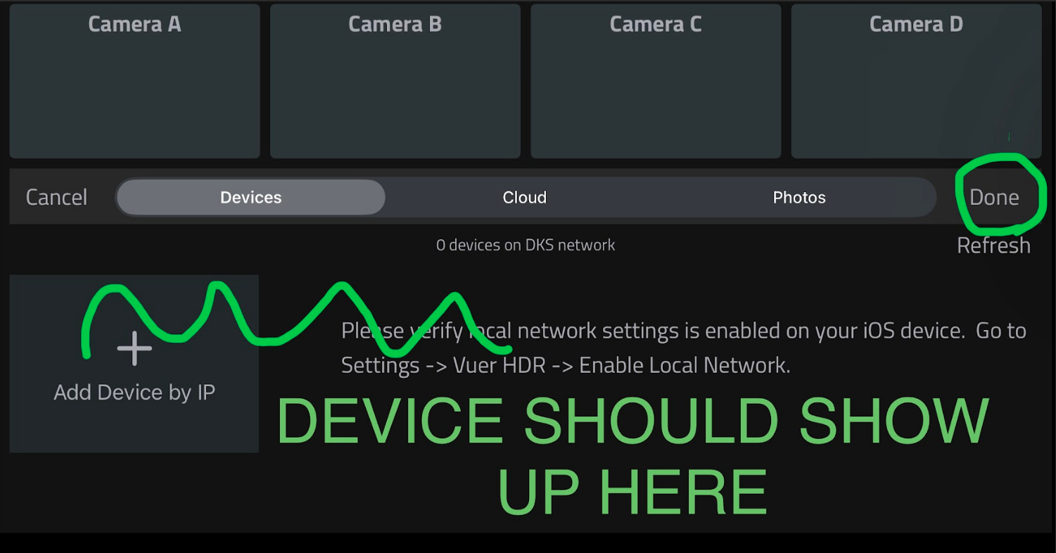 Open VUER App, tap CAMERA, on the upper, left-hand corner, choose your device(s), then tap Done.